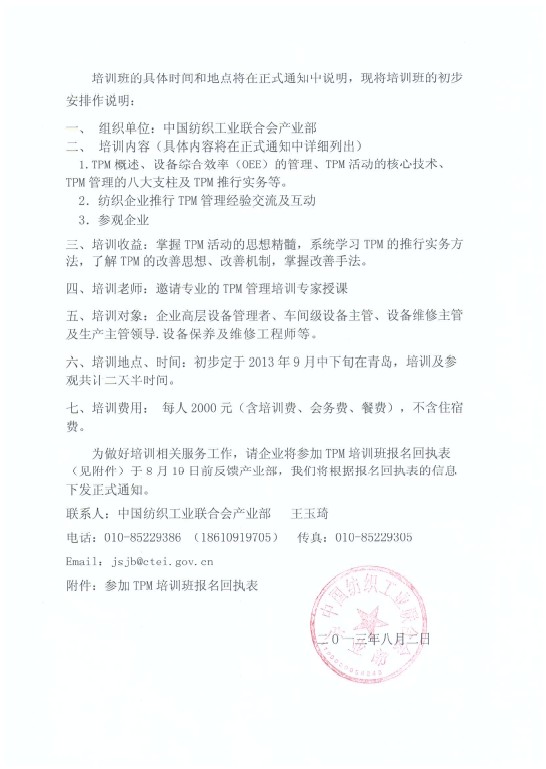 關(guān)于舉辦紡織企業(yè)“TPM”全面生產(chǎn)維護(hù)高級(jí)培訓(xùn)班的預(yù)通知