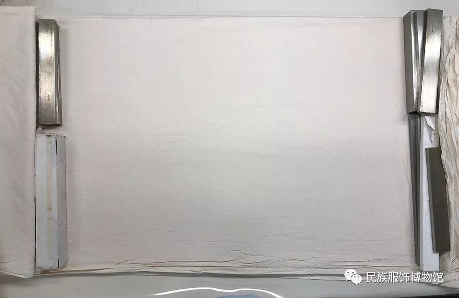 將文物從水中托出,放在塑料膜上,借助文物上殘留的水分整理其經(jīng)緯線。整理好后,用毛巾吸收水分,并貼一層濾紙繼續(xù)吸收水分,文物的兩面分別貼3至4層。貼好濾紙后,放入干燥平整的白布中,兩端壓固控制干燥。