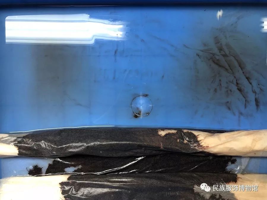 浸泡結(jié)束,除去上面覆蓋的無酸綿紙,用大羊毛刷按住一側(cè),小毛刷刷洗文物表面,兩面各刷一次,要按照織物經(jīng)緯方向刷洗。之后觀察現(xiàn)象,表面活性劑變渾濁,有大量深色的沉淀物。