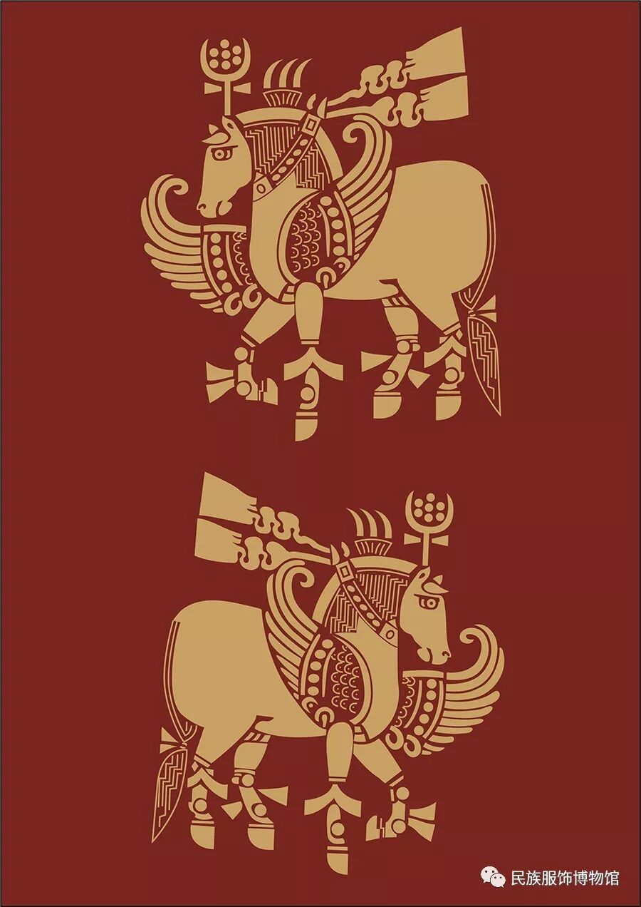 中國絲綢博物館藏有一件紅地翼馬紋錦,每匹馬高約 19 厘米,寬約15 厘米。這件紋錦無論從顏色上,翼馬的形態(tài)及尺寸大小上均與本文中修復(fù)的紅地翼馬紋錦殘片高度相似。