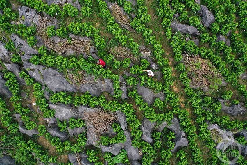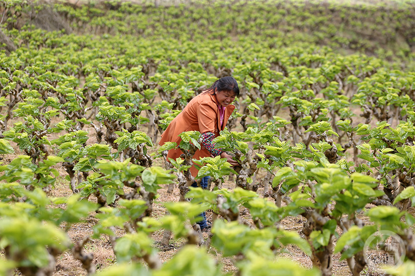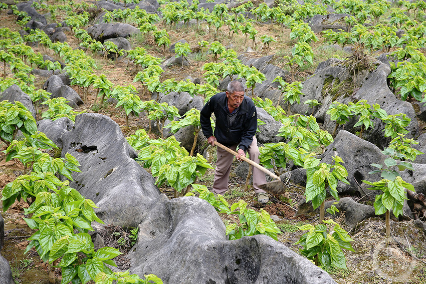 重慶市黔江區(qū)是全國(guó)石漠化嚴(yán)重發(fā)生地區(qū)之一。該區(qū)將石漠化治理與蠶桑產(chǎn)業(yè)發(fā)展相結(jié)合,大量栽植桑樹(shù),并把蠶桑作為農(nóng)民脫貧致富、鄉(xiāng)村振興的產(chǎn)業(yè)來(lái)發(fā)展。圖為4月13日,黔江區(qū)濯水鎮(zhèn)雙龍村村民在管護(hù)石漠化地里的桑樹(shù)。