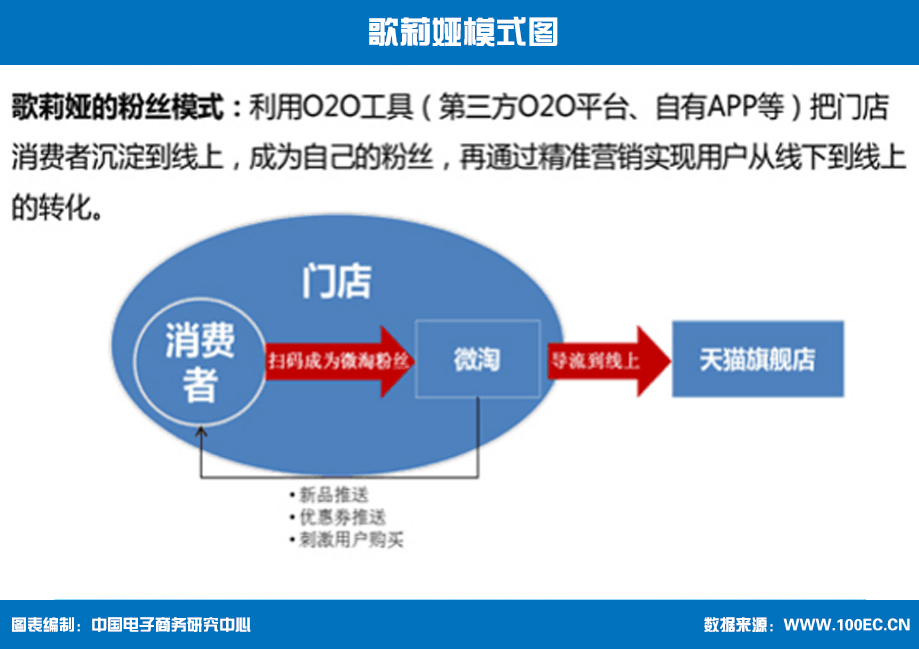 歌莉婭在O2O方面選擇了與阿里旗下的微淘合作。2013年,歌莉婭在精選出的全國(guó)各地近百家門(mén)店內(nèi)擺放了微淘活動(dòng)物料,吸引到店顧客通過(guò)掃門(mén)店內(nèi)的二維碼成為歌莉婭的微淘粉絲,再加上店鋪營(yíng)業(yè)員的針對(duì)性引導(dǎo)和現(xiàn)場(chǎng)掃碼指導(dǎo),短短5天內(nèi)歌莉婭的粉絲增長(zhǎng)了20萬(wàn)(線下單個(gè)門(mén)店每年新增用戶1~2萬(wàn)個(gè))。借助歌莉婭微淘平臺(tái),這些粉絲可以隨時(shí)接收歌莉婭發(fā)布的新品推薦、優(yōu)惠促銷(xiāo)、穿衣搭配建議等信息,點(diǎn)擊微淘的推薦鏈接可以直接進(jìn)入手機(jī)淘寶的歌莉婭天貓旗艦店,促進(jìn)用戶直接下單。